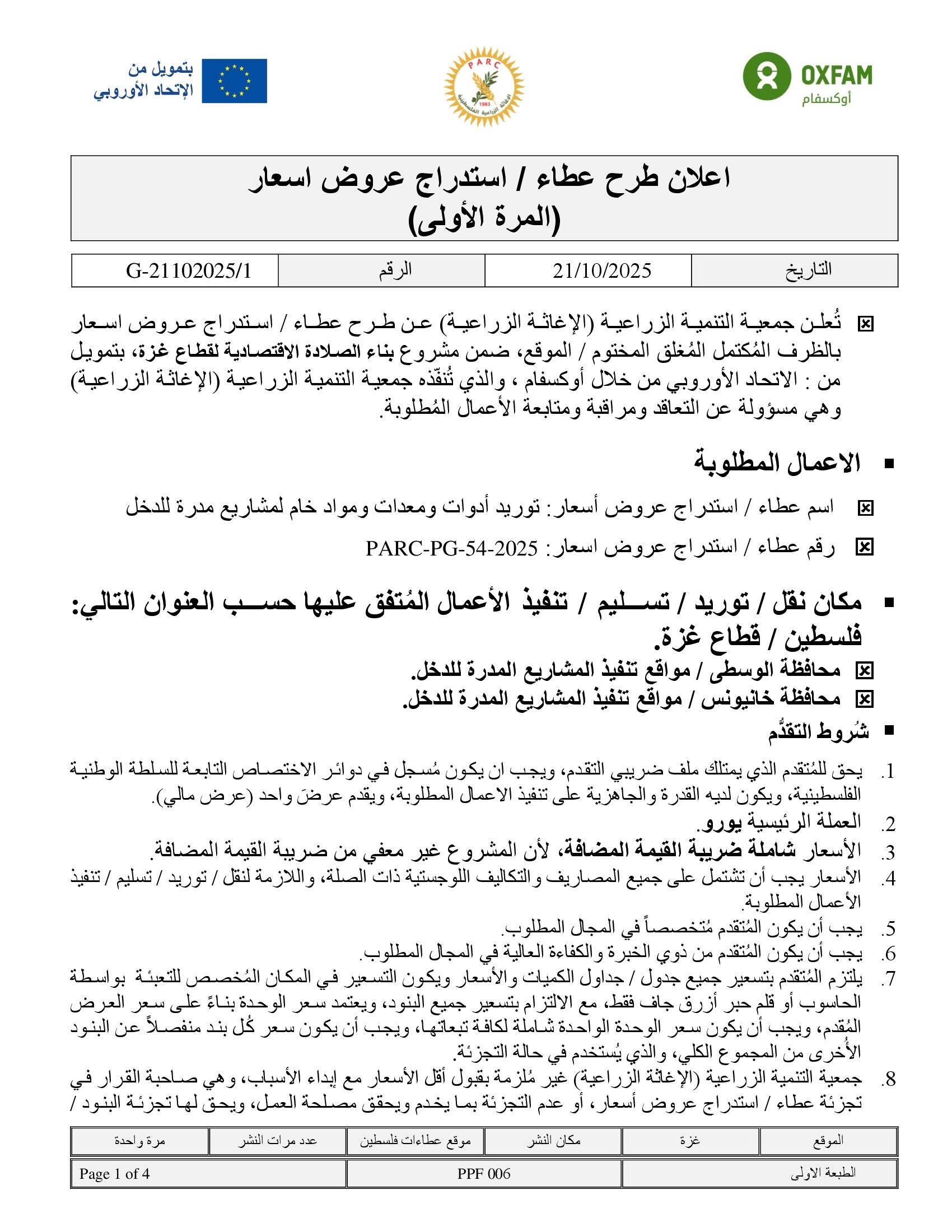 المؤسسة : جمعية التنمية الزراعية موقغ : https://pal-arc.org/tenders/ar بريد : info@pal-arc.org