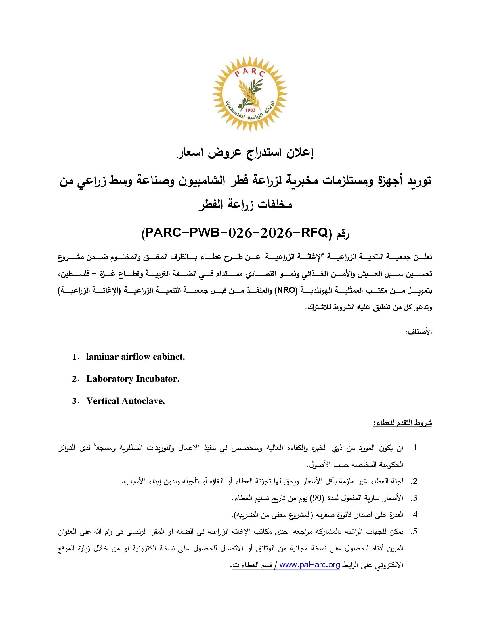 توريد أجهزة ومستلزمات مخبرية لزراعة فطر الشامبيون وصناعة وسط زراعي من مخلفات زراعة الفطر